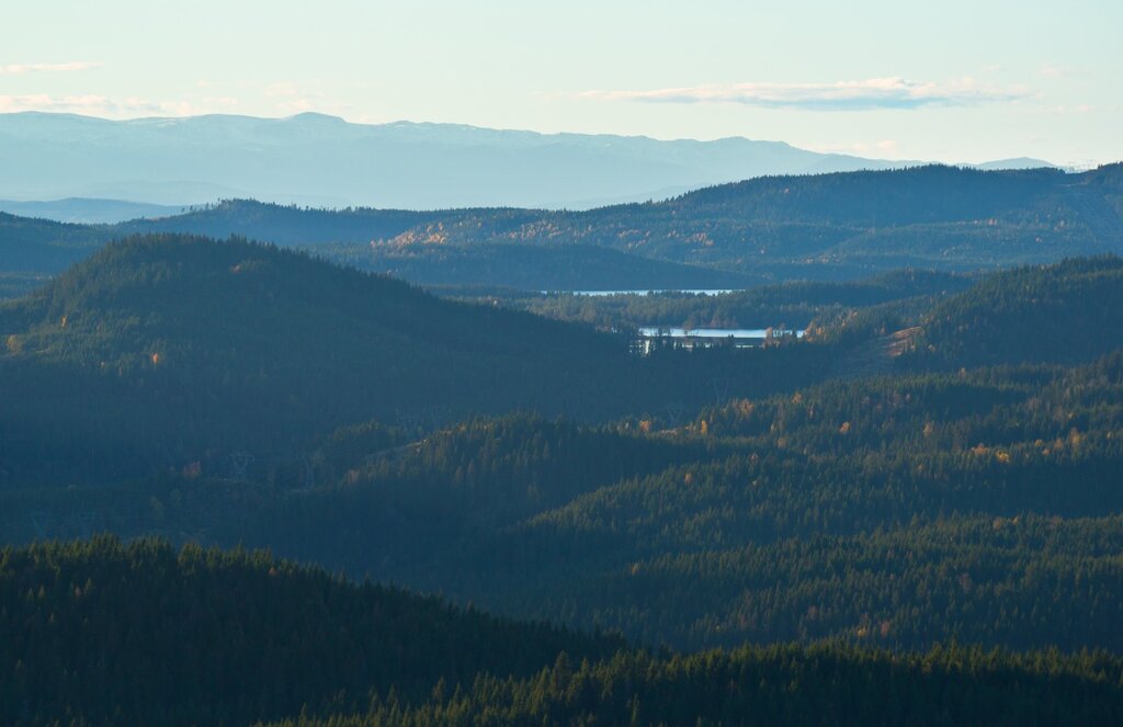 Solen var i ferd med å gå ned denne strålende torsdagen i oktober, og fotografen valgte å bli på Askehøgda en stund til, istedenfor å haste ned til Sørkedalen i den siste rest av dagslys. Utsikten nordvestover mot Krokskogen var fortsatt brukbar, selv om åsene kastet mørke skygger over deler av landskapet. På bildet ser vi Vesleflåten og Storflåtan, og rett til venstre for disse vannene har vi Oppkuven.