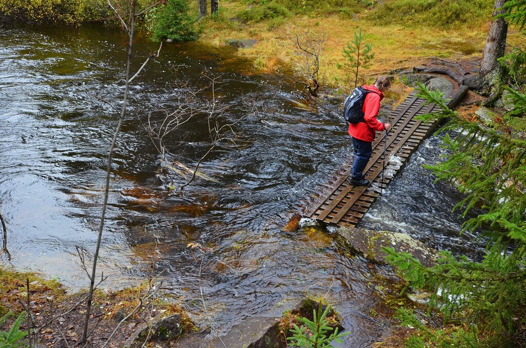 Med så høy vannføring at vannet går helt oppunder kloppa og slår opp gjennom den, kan det være litt spennende å krysse elva. Strøm og oppdrift gjør at kloppa beveger seg merkbart når man går over den.