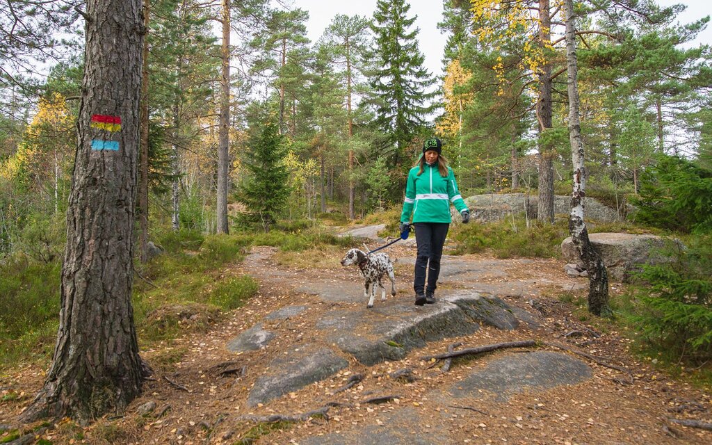 Gunn Eli Marcussen hadde med bikkja på tur i Kjekstadmarka i dag. Her er de foreviget rett nord for Blåfjellhytta, på vei mot Heggedal.