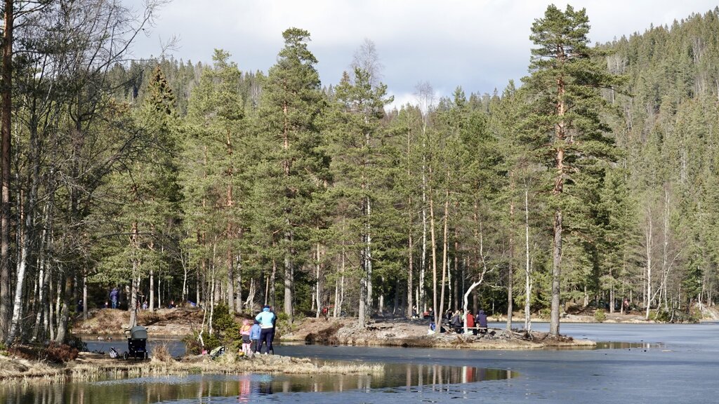 Strømsdammen ligger ikke mer enn 300 meter over havet, og isen er i ferd med å slippe taket første påskedag i 2020. Koronafaste beboere fra nærområdet fylte en rekke av de stedene hvor det var mulig å ta seg en rast i solen, men det var god plass til alle.